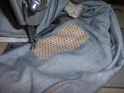 以前はジーンズの切れ端であてていましたが、かたくなってはきにくくなってしまうので薄手のコットンツイルなどをつかうようになりました。